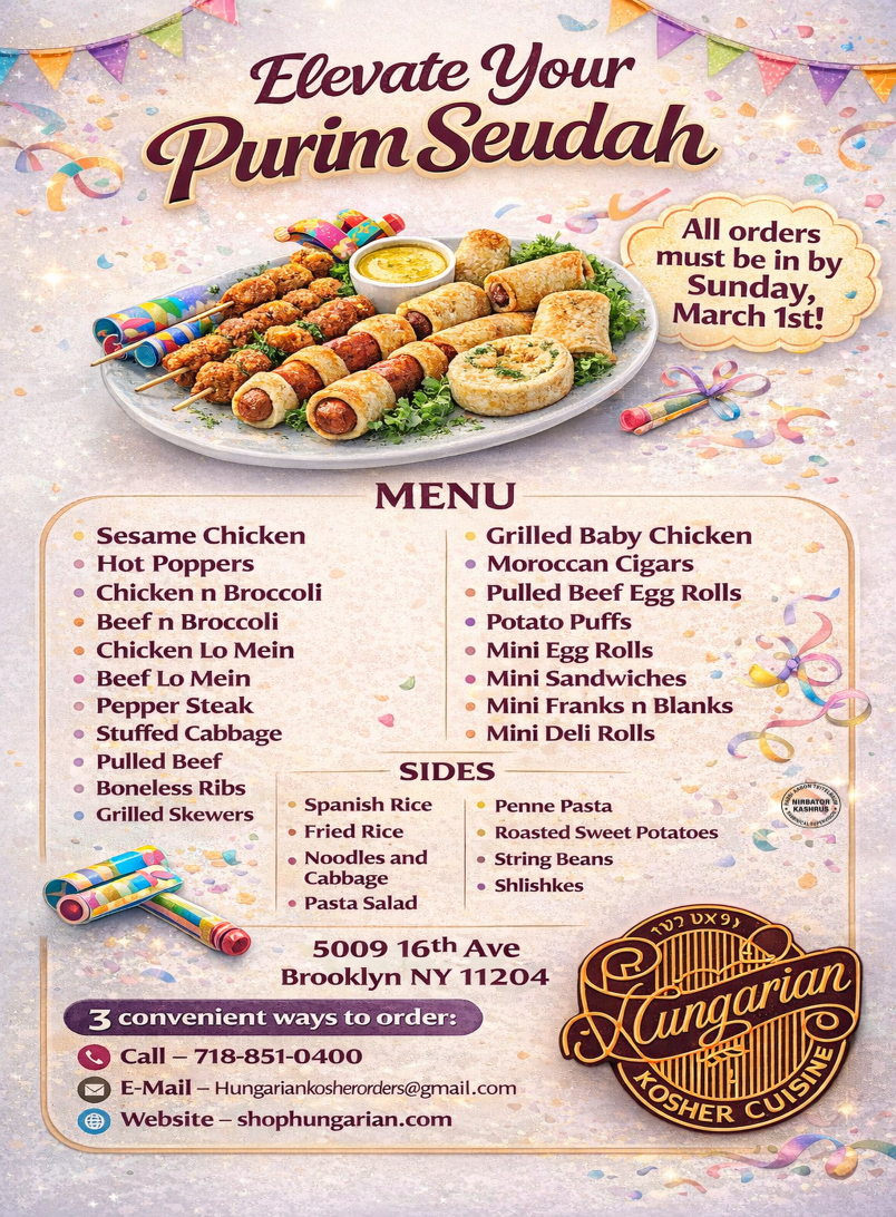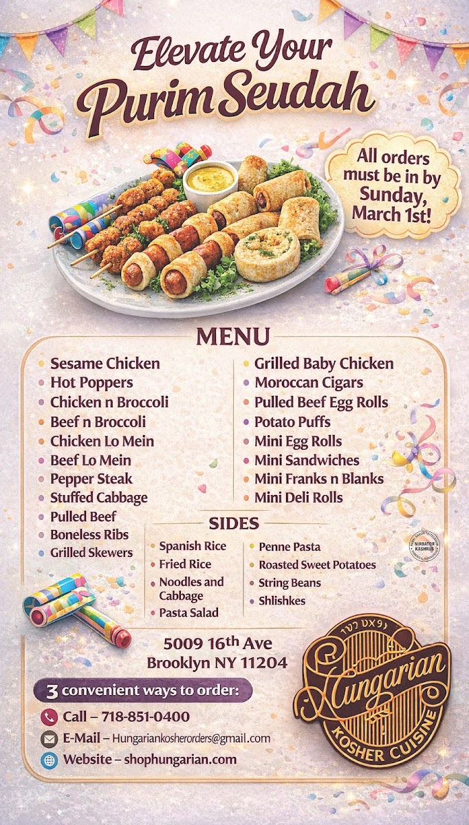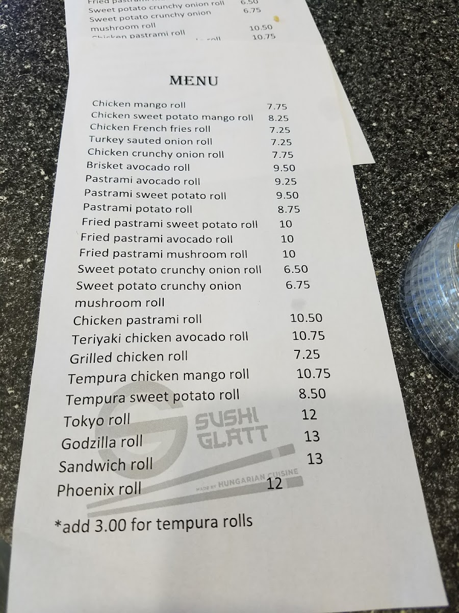 The menu at Hungarian Kosher Cuisine offers a wide variety of options, catering to both deli-style and traditional kosher dishes. The deli section includes choices like Pastrami Sandwich, Turkey Sandwich, and the larger Monster Sandwich. For those preferring lighter options, there are side dishes such as Tri Color Pasta Salad and Potato Knish, along with a selection of salads, including Cucumber Salad and Coleslaw in small and large portions. If you're in the mood for heartier meals, there are various Grilled Chicken options, such as Grilled Chicken Steak and Grilled Baby Chicken, alongside Breaded Cutlets and Sesame Chicken.
